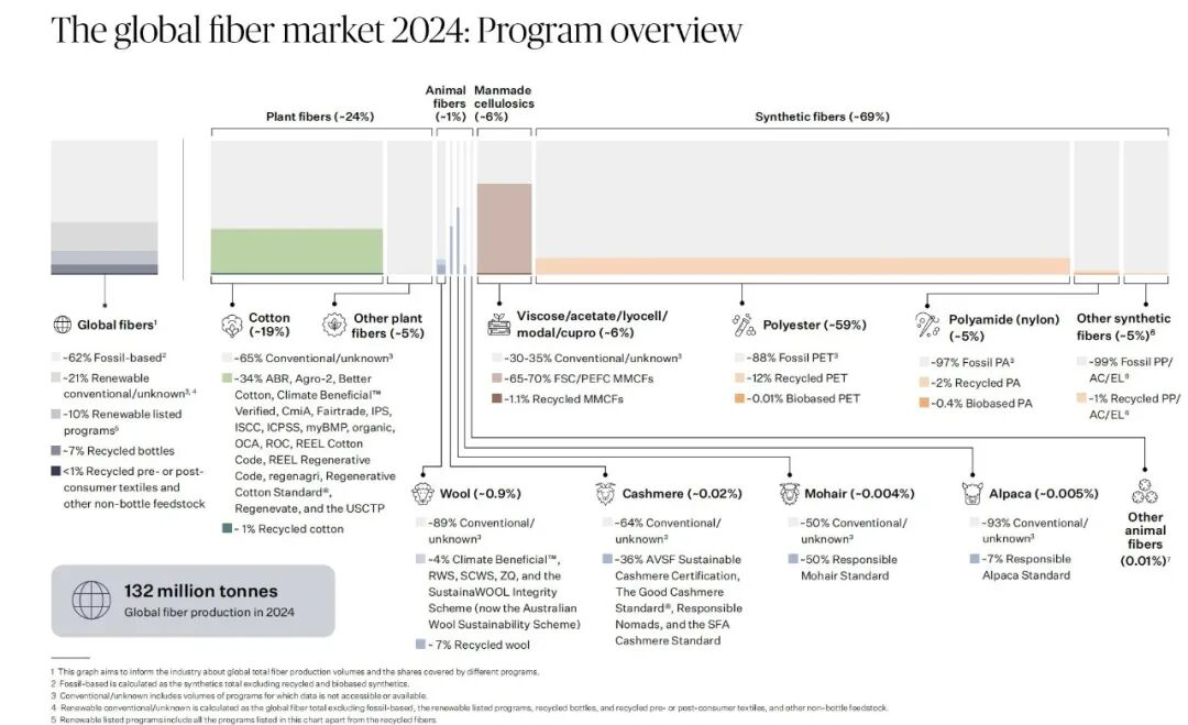 根据 Textile Exchange《2025年材料市场报告》,2024年全球再生纤维市场份额维持在7.6%,虽规模仍有限,但已成为衡量行业循环经济发展水平的核心指标。当前再生材料市场呈现 “品类不均衡、技术待突破、原料依赖单一” 的特征 —— 再生聚酯占据绝对主导,而纺织品到纺织品(textile-to-textile)的回收比例不足1%,混纺面料回收、认证追溯体系完善等仍是亟待解决的关键问题。