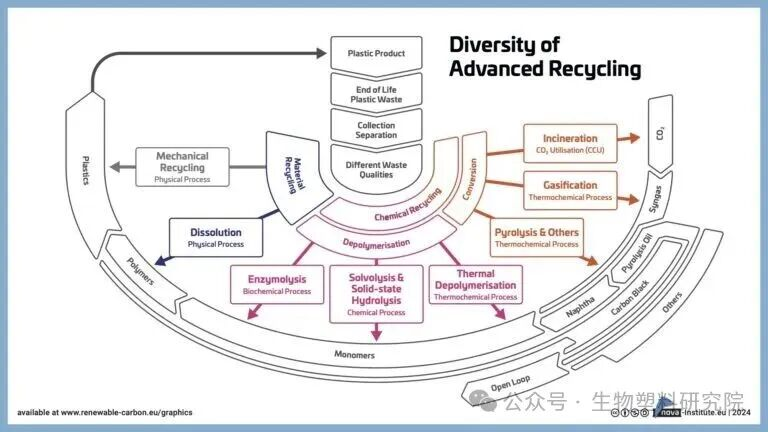 虽然机械回收仍然非常重要,但它在处理混合垃圾及受污染的垃圾方面存在局限性,因此需要采取其他补充措施。先进的回收技术提供了多种处理方法,例如溶解、酶解、溶剂分解、热解和气化等,这些方法能够将各种塑料垃圾转化为有价值的原材料,如单体、石脑油、二次可利用的化学物质以及合成气等。这些原材料可以重新用于塑料产品的生产过程中,从而实现塑料的循环利用。