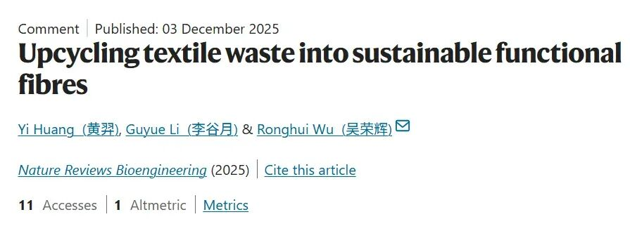 鉴于此,南洋理工大学吴荣辉教授团队近日在《Nature Reviews Bioengineering》发表评论文章”Upcycling textile waste into sustainable functional fibres”,系统阐述了将纺织废料升级再造为高价值功能材料的前沿技术与无限可能,为可持续纺织产业指明方向。