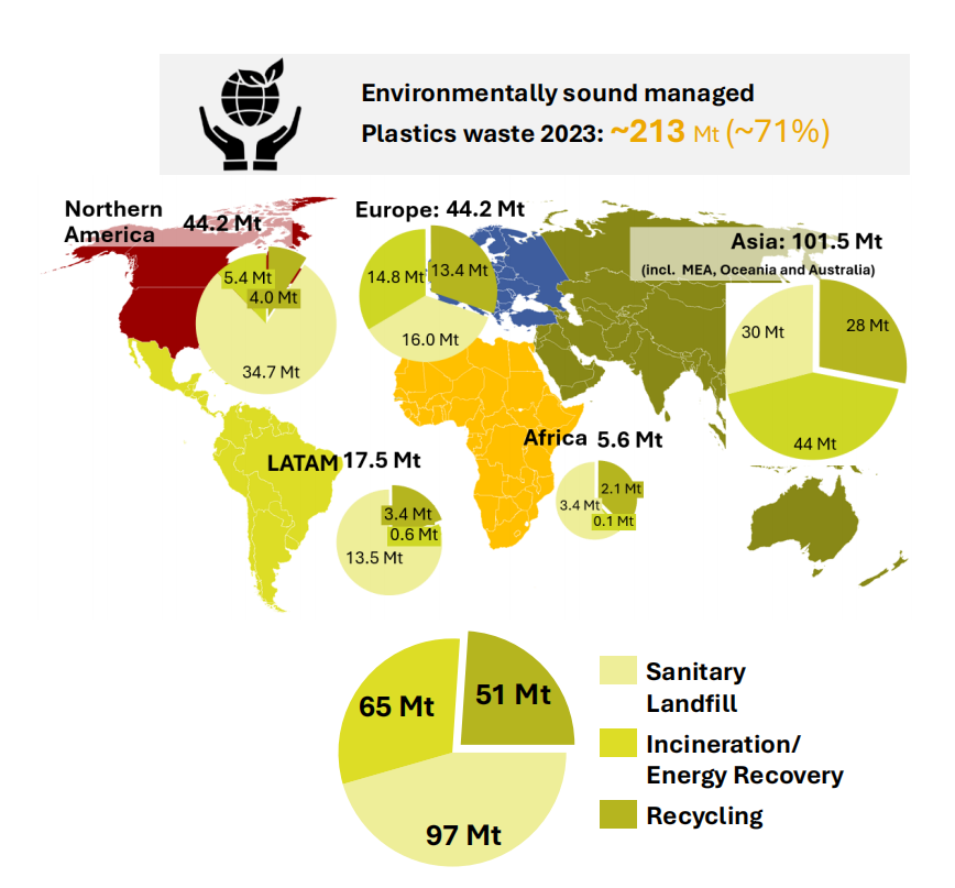 亚洲:塑料废弃物1.482亿吨,69%(1.015亿吨)得到环境友好型管理,回收总量全球领先,但内部各国差异巨大。