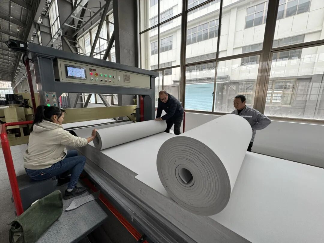 1月下旬,记者来到位于仙游县枫亭镇的福建腾达亿高新材料有限公司采访看到,厂房内智能化设备有序运转,生产出一卷卷灰色的泡棉,其表面呈现出细密的蜂窝状气孔。在切割区,工人们根据指令操控设备,调整泡棉尺寸。一旁的质检区内,则堆放着刚刚下线的产品。